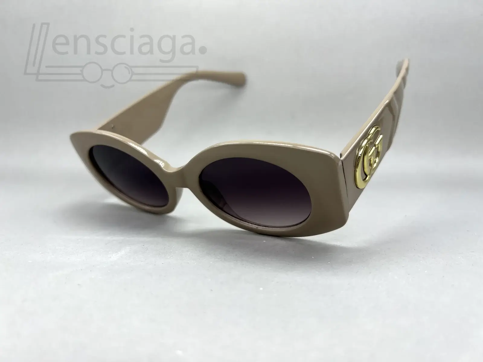 Sleek and modern, these oval sunglasses feature a glossy mocha-toned frame with dark gradient lenses and a bold gold temple accent for a refined, fashion-forward finish.