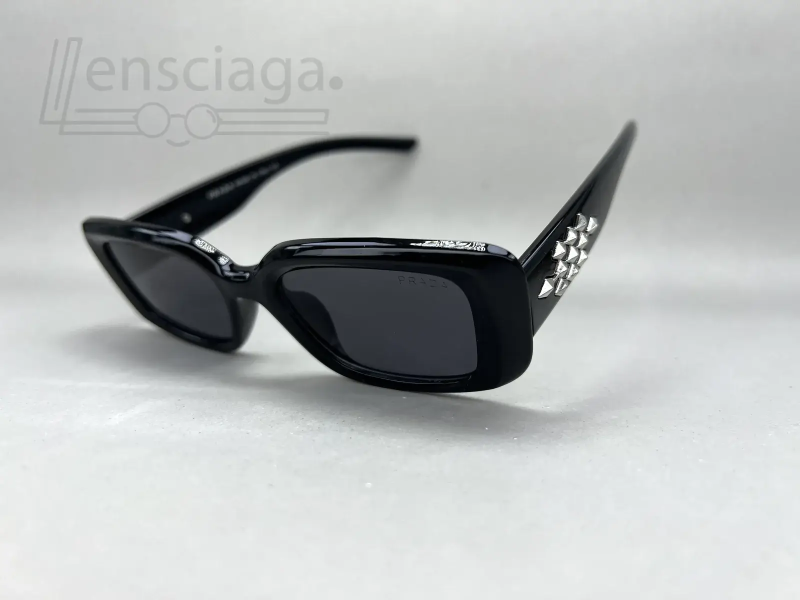 The dark tinted lenses provide strong sun protection and a clean, monochromatic aesthetic that pairs effortlessly with any outfit. What truly sets this design apart is the geometric silver stud detailing along the temples, adding a touch of attitude and luxury-inspired craftsmanship.