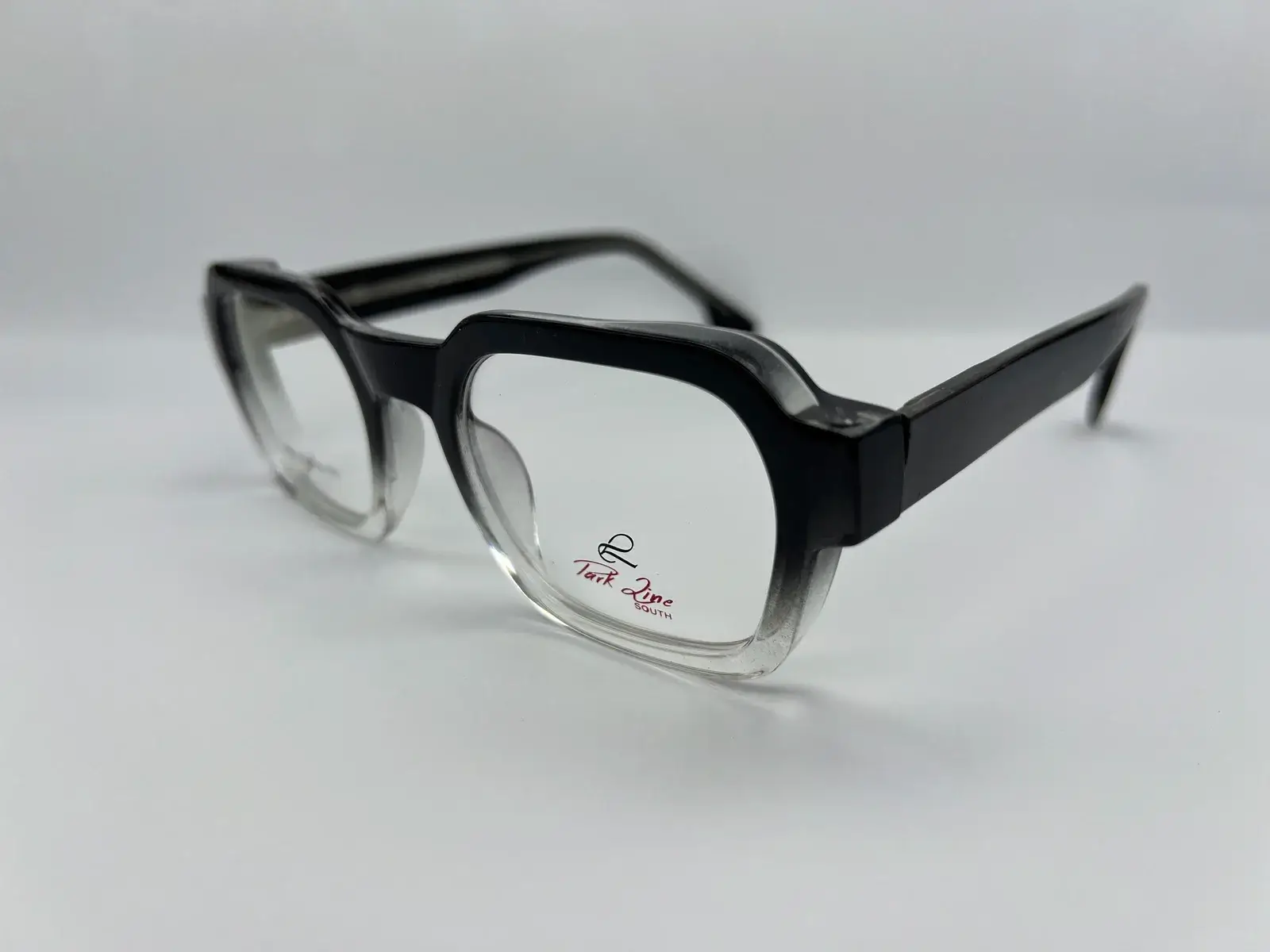 The front showcases a deep black acetate top that fades seamlessly into a crystal-clear lower rim, creating a refined gradient effect that softens the frame’s bold geometry. Thick, solid temples enhance durability and provide a secure fit, making the frame suitable for extended daily use.