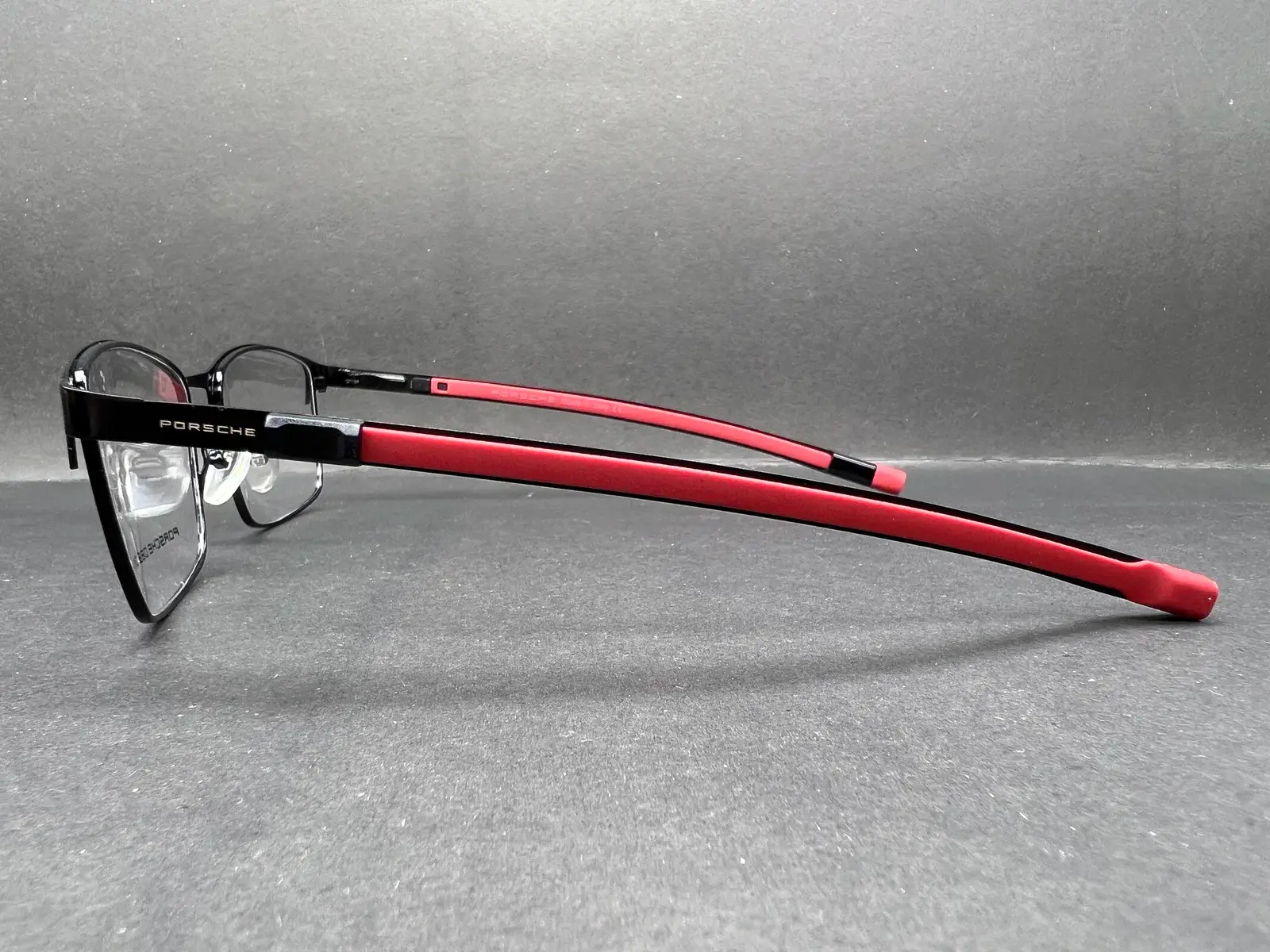 The standout detail lies in the slim metal temples with red rubberized inserts, providing both visual contrast and enhanced grip for long-lasting comfort. Adjustable silicone nose pads ensure a secure, customized fit, while the lightweight construction minimizes pressure during extended wear. Subtle Porsche Design branding on the lens and temple completes the look with understated confidence.