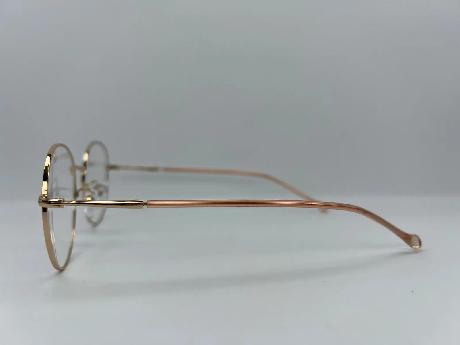 Crafted from beta titanium, the frame is exceptionally light, durable, and corrosion-resistant, making it ideal for daily wear. The warm rose-gold finish adds a subtle glow, while slim matching temples and adjustable silicone nose pads ensure comfort without compromising aesthetics.